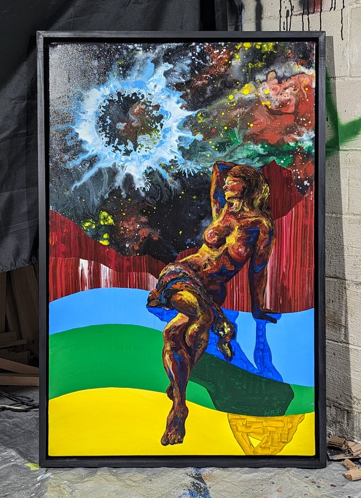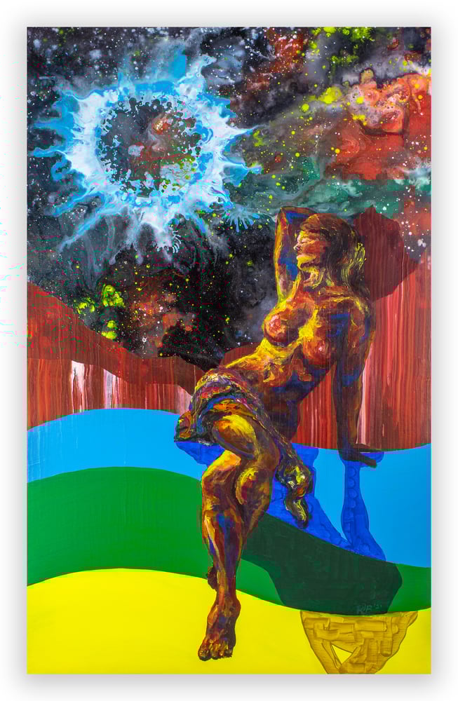 This is the first strictly Surrealist painting I've ever completed. I wanted to explore several styles of painting and combine them to construct a wild environment with personal meaning and influence. The cosmos, humanity, and nature coexist in this dark, but colorful, large painting.