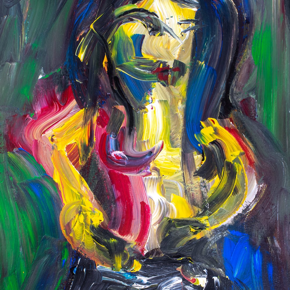 In Six Years and all I Have is this Painting, I became more aggressive in technique and color usage. I wanted it to be much looser in brushwork, at it represents an almost comical friendship that no longer exists after coming to realize that it only worked one way. I use only the highest quality acrylics in my work.